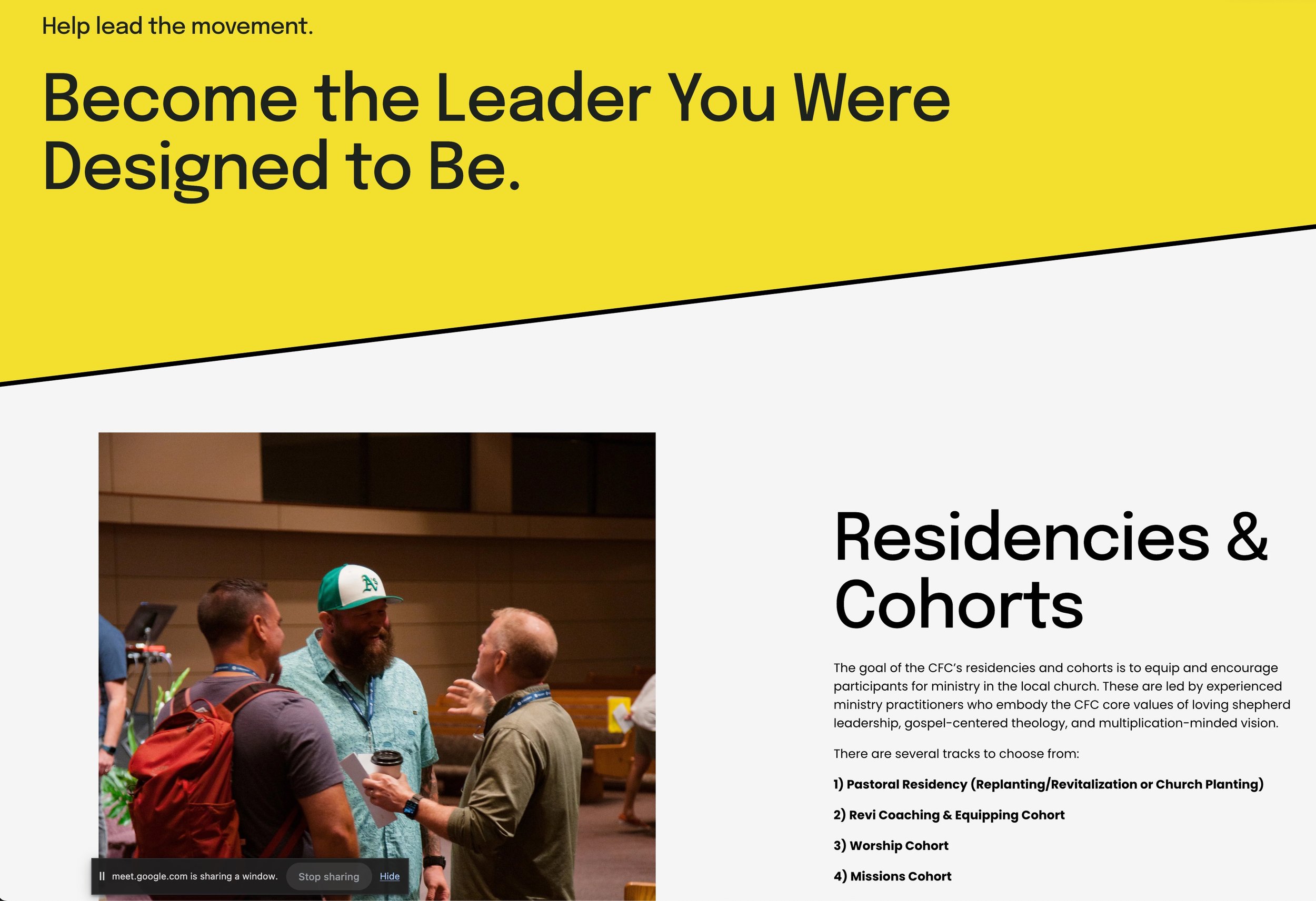Each year, the CFC offers a variety of leadership cohorts designed to train, equip, and develop leaders across all of our churches. These cohorts provide biblical, practical, and relational tools to help men and women grow in their calling and effectiveness in ministry. All participants in these cohorts here in the Springfield and surrounding area will be connected with leaders from across the country as well as with leaders here at Calvary Springfield.